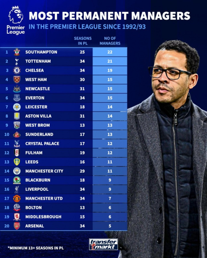 直播吧4月26日讯德国转会市场统计了1992-1993赛季以来各队在英超经历的主帅人数,并列出榜单,南安普顿22人最多,热刺21人、切尔西19人。